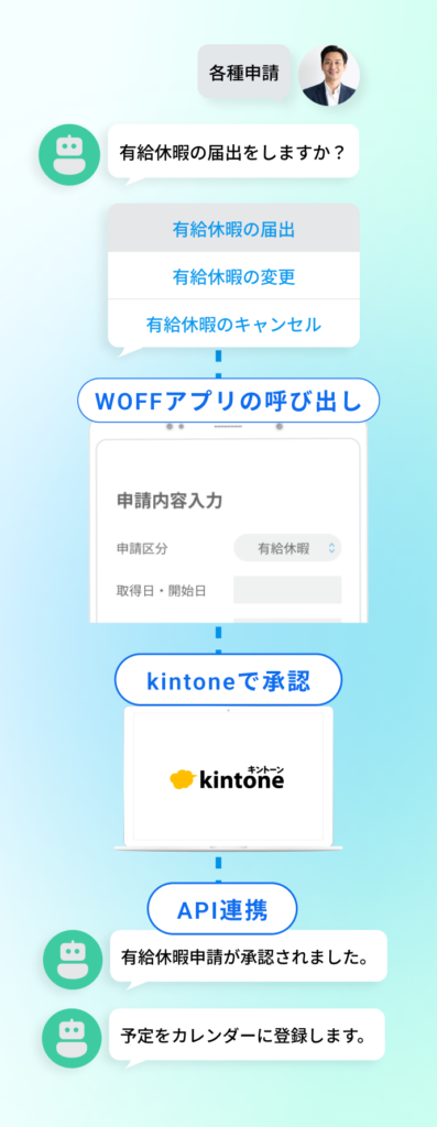 有給休暇等の各種社内申請にBotとWOFFを活用いただいています。kitnoneをデータベースに、入力画面をWOFFで作成し、LINE WORKS上から申請できるようにしています。